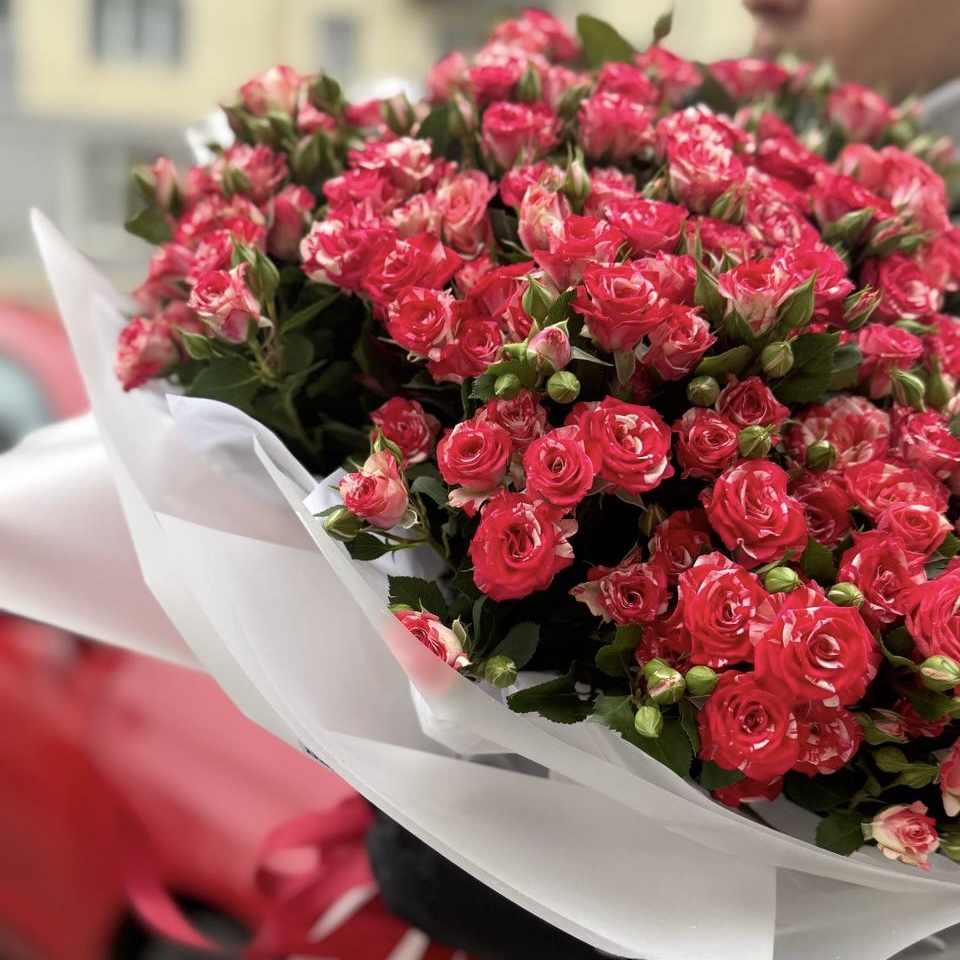 Состав: 35 веток кустовых роз, флористическая пленка, атласная лента.