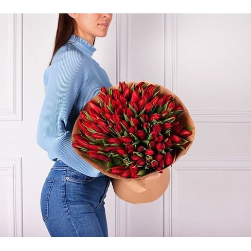 Состав: 101 красный тюльпан, крафт бумага, атласная лента.