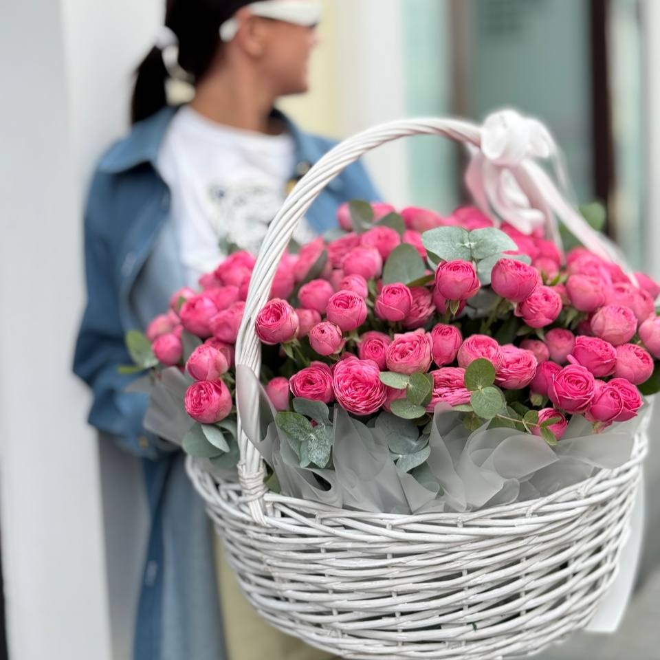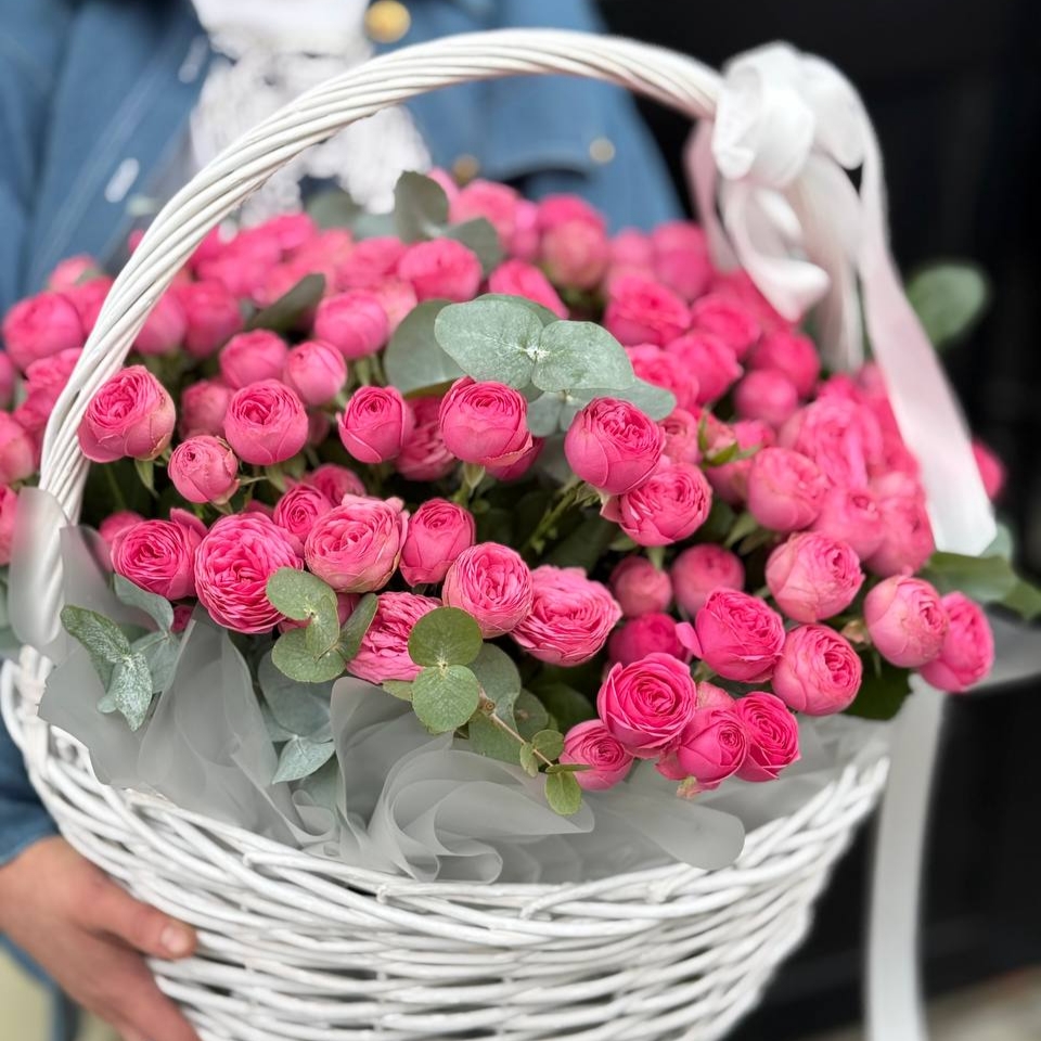 Состав: 41 ветка кустовой пионовидной розы,эвкалипт, флористическая губка, корзина, атласная лента.